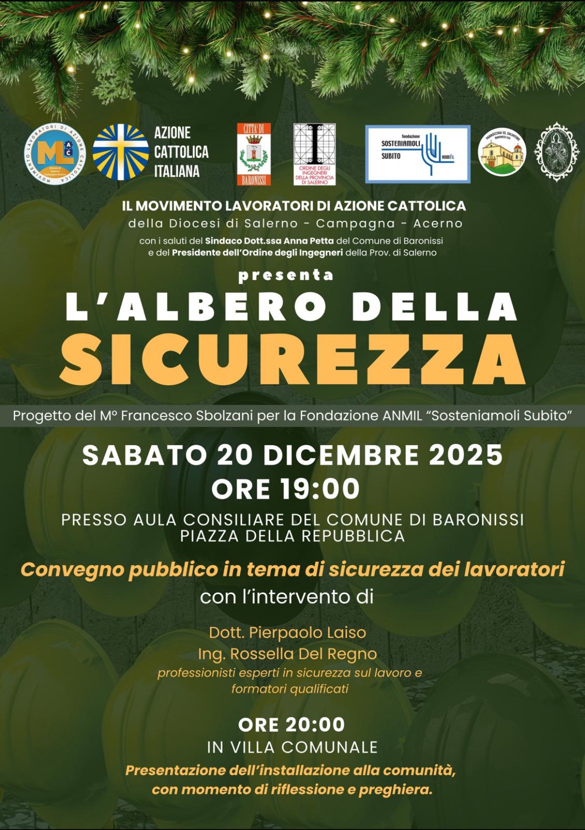 Si informano gli iscritti che sabato 20 dicembre p.v. si svolgerà presso l’Aula Consiliare del Comune di Baronissi (SA) il Convegno pubblico in tema di sicurezza del lavoro dal titolo “L’albero della sicurezza” , organizzato dal Movimento Lavoratori di Azione Cattolica di Salerno – Campagna – Acerno con il patrocinio morale dell’Ordine.