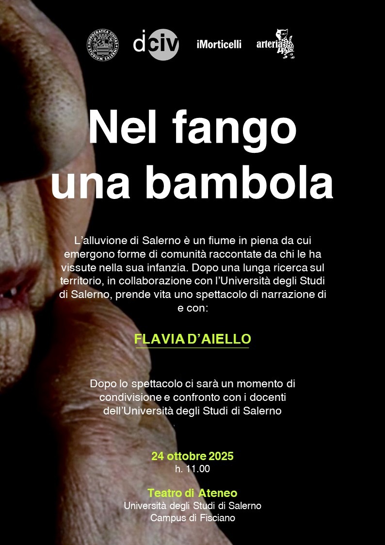 Venerdì 24 ottobre alle ore 11:00 presso il Teatro di Ateneo (edificio A2) dell’Università degli Studi di Salerno, si terrà lo spettacolo teatrale “Nel fango una bambola” promosso dal Dipartimento di Ingegneria Civile (DICIV) con il patrocinio morale dell’Ordine.